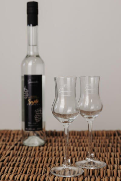 Szanandor sárgamuskotály szőlő pálinka 0.5 l 44% + 2 db pálinkás kehely (mszp2kcs)